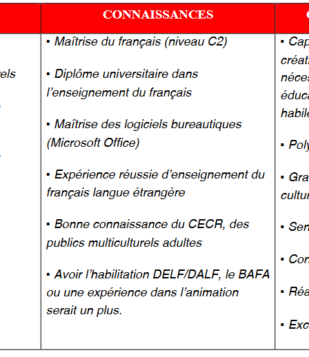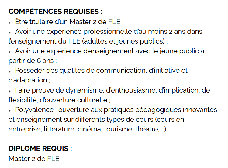 - Les compétences à avoir figurent à la fois sous la forme de la validation d’un diplôme (M2 FLE), d’une expérience professionnelle et de compétences autres qui peuvent être du domaine de vos passions personnelles. Le diplôme prime assurément sur la durée de votre expérience si celle-ci a obtenu de très bons retours, lettre de recommandation à l’appuie.